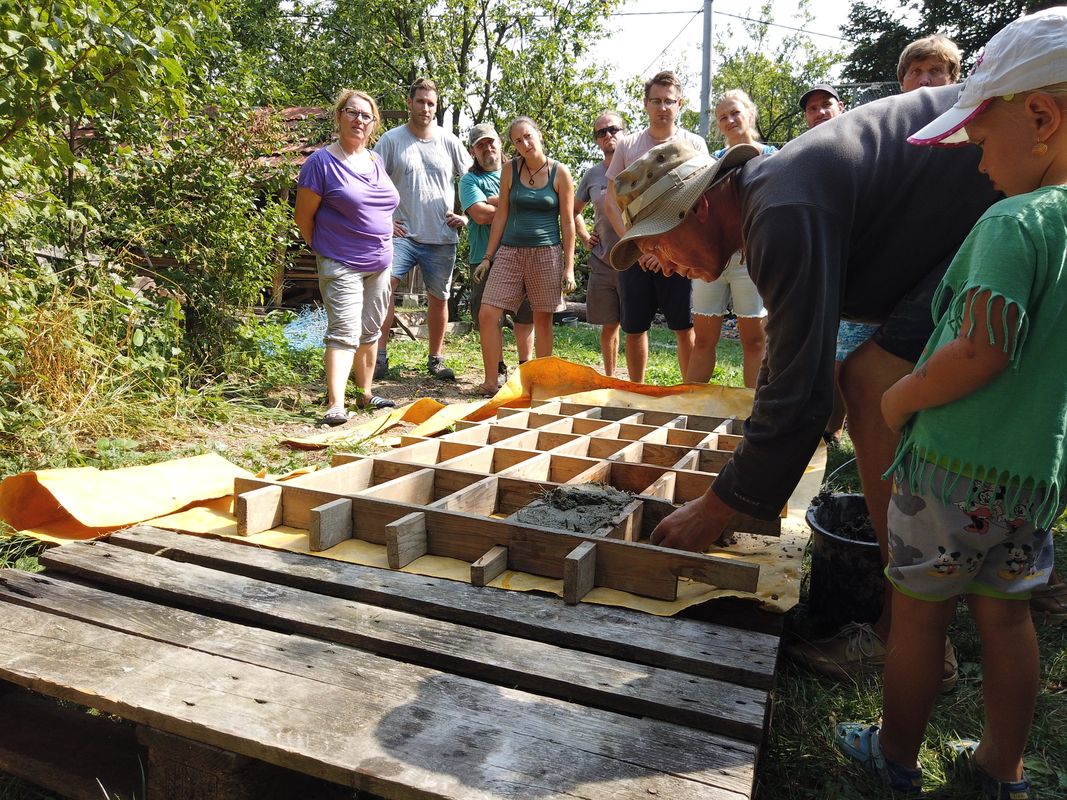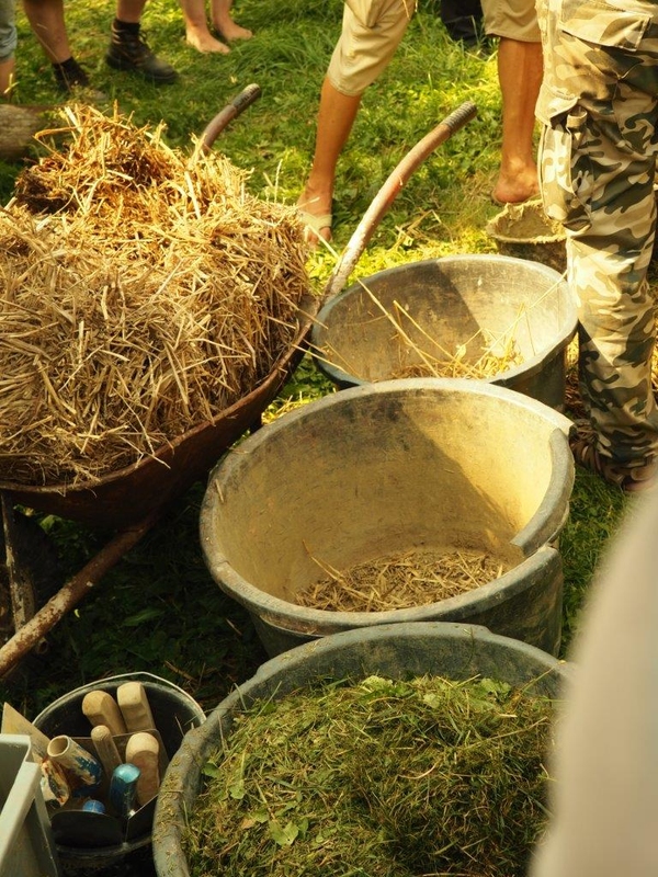Tvoříme ukázky ze slámy a hlíny jako například Cordwood (stěna z dřevěných polínek lepených hlínou), COB (lavice a ornamenty tvarované z hlíny smíchané se slámou a pískem), nabíjenice, dekorace ze starých lahví a skel zasazených do hlíny.