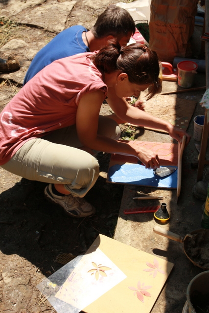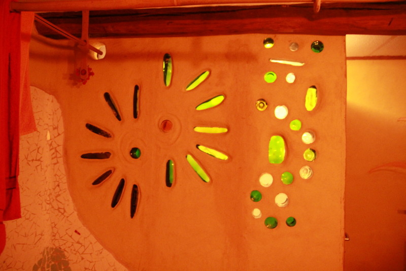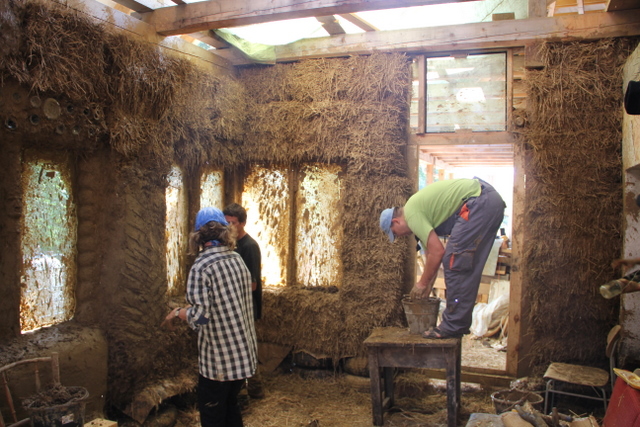 Budujeme nyní slaměnohliněný domek pro děti. Tvoříme ukázky ze slámy a hlíny jako například Cordwood (stěna z dřevěných polínek lepených hlínou), COB (lavice a ornamenty tvarované z hlíny smíchané se slámou a pískem), nabíjenice, dekorace ze starých lahví a skel zasazených do hlíny.